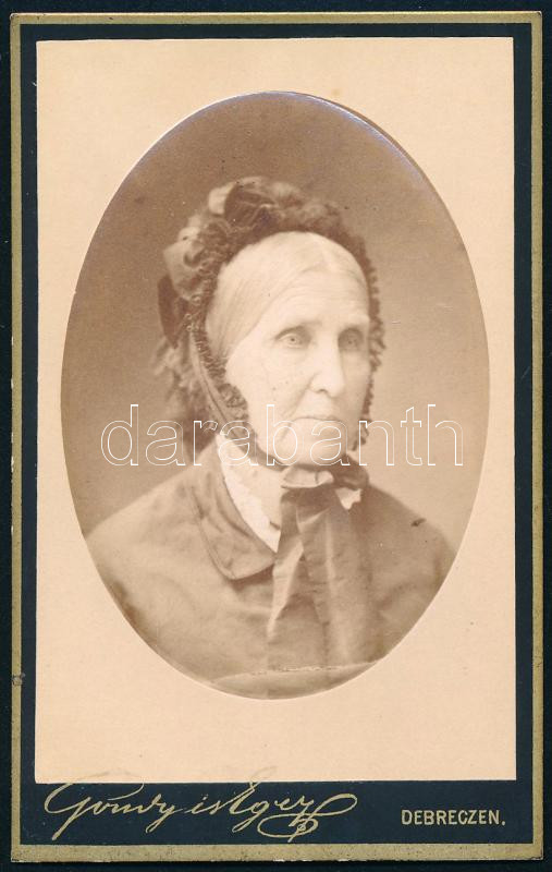 Leírás: 1864 Idős asszony portréja, keményhátú fotó Gondy és Egey debreceni műterméből, 10,5×6,5 cm