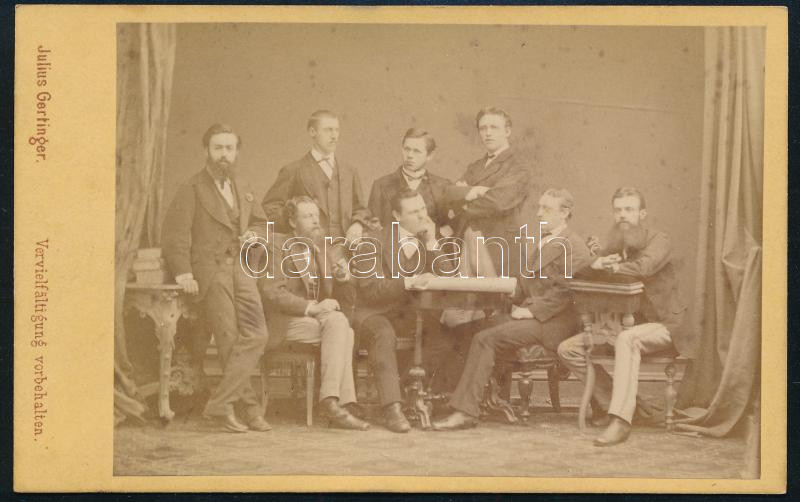 1870 Bécs, a Magyar Nyugati Vasút (Ungarische Westbahn) közös magyar-osztrák vasúttársaság tisztviselőinek csoportképe, vizitkártya méretben; keményhátú fotó Julius Gertinger műterméből, a hátoldalon feliratozva, 7x11 cm