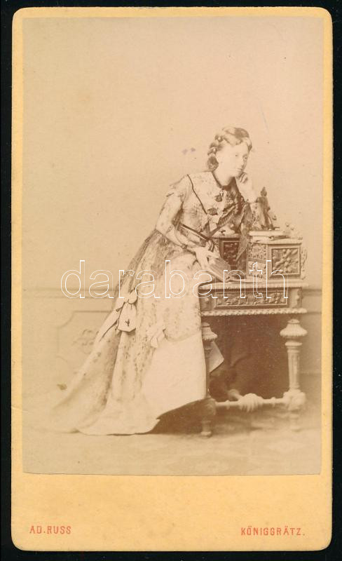 Leírás: 1872 Königgrätz, fiatal hölgy portréja, vizitkártya, hátoldalán autográf sorokkal (Frau Walburga/Malburga?), 10x6 cm