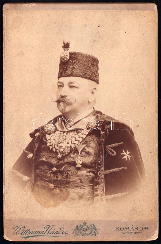 1900 Nadasdi Sárközy Aurél (1845-1916) Komárom vármegye és Komárom szabad királyi város főispánjának portréfotója, a hátoldalán saját-kezű dedikációjával, kemányhátú fotó Wittmann Nándor komáromi műterméből, a felületén folttal, kis kopásnyomokkal, 16x10 cm