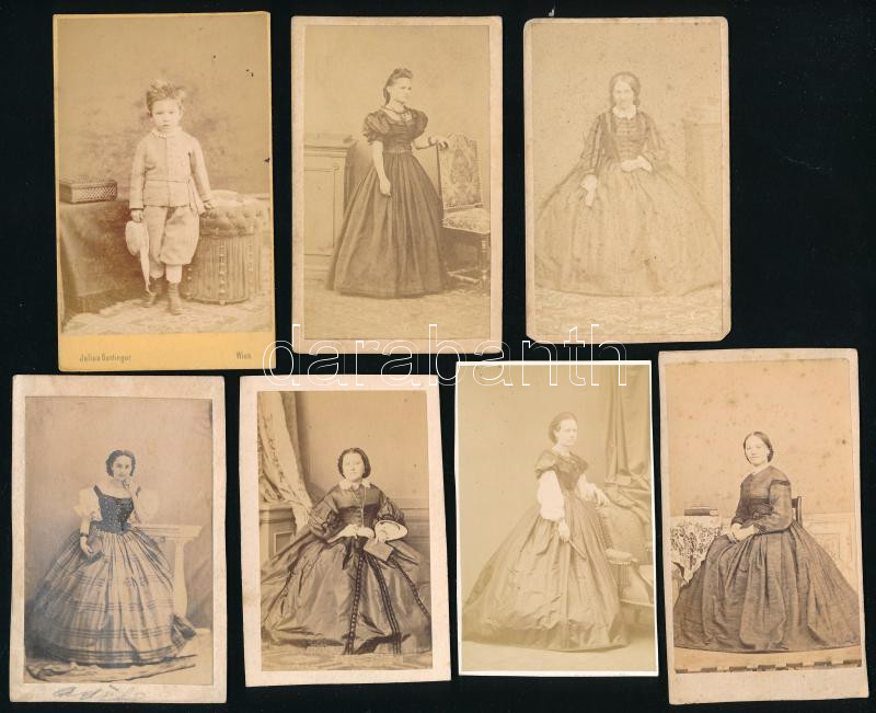 Leírás: cca 1860-1870 Hölgyportrék és egy gyerekportré, 7 db vizitkártya osztrák műtermekből, vegyes állapotban, 10x6 cm körül