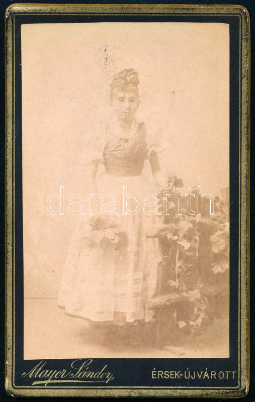 Leírás: cca 1890 Lány egészalakos portréja, keményhátú fotó Mayer Sándor érsekújvári műterméből, vizitkártya, némi kopással, 10,5x6,5 cm