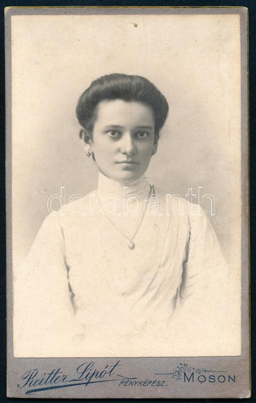 cca 1900-1910 Fiatal hölgy portréja, keményhátú fotó Reitter Lipót mos... https://www.darabanth.com/hu/444-Gyorsarveres/444.0/Fotomuveszet/Foto~500025/cca-1900-1910-Fiatal-holgy-portreja-kemenyhatu-foto-Reitter-Lipot-mosoni-mutermebol-vizi~II2925595