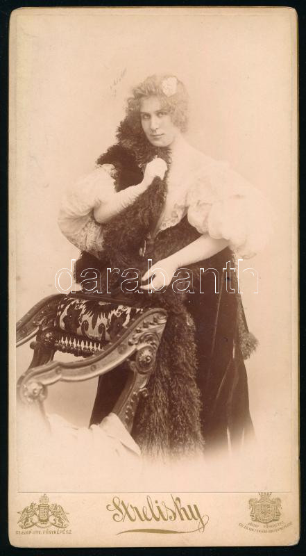cca 1900 Márkus Emília (1860-1949) színésznő, a Nemzeti Színház örökös és tiszteletbeli tagjának portréfotója, keményhátú fotó Strelisky budapesti műterméből, 20x11 cm