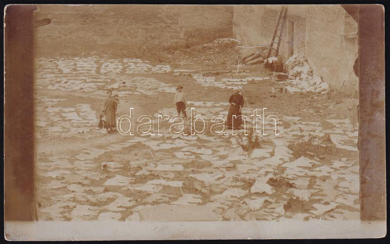 cca 1910 Állatbőrök szárítása, fotólap, 9×13 cm