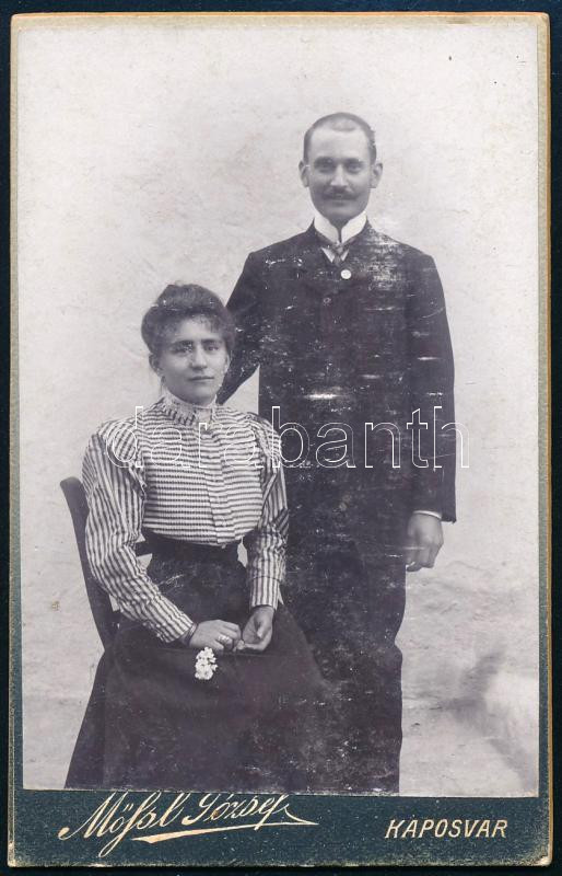 Leírás: cca 1910 Házaspár portréja, keményhátú fotó Mössl József kaposvári műterméből, vizitkártya, némi kopással, 10,5x6,5 cm