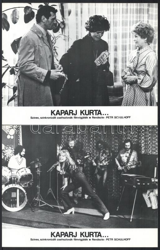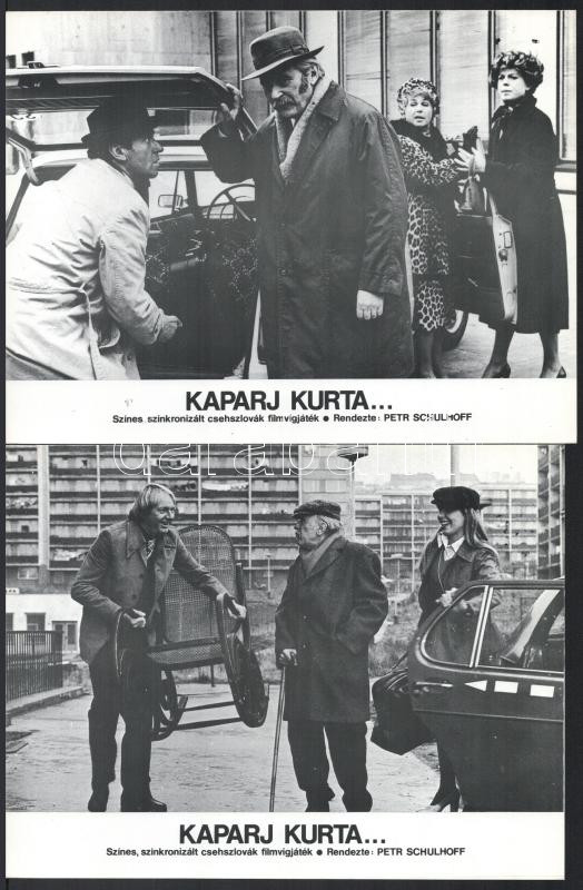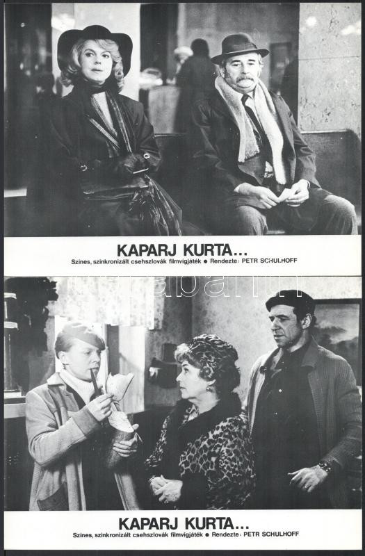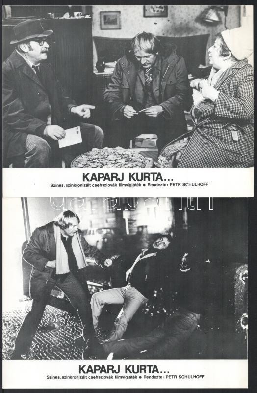 cca 1980 ,,Kaparj kurta" című csehszlovák filmvígjáték jelenetei és szereplői, 8 db produkciós filmfotó nyomdatechnikával sokszorosítva, egyoldalas nyomással, kartonlapra, a használatból eredő (esetleges) kisebb hibákkal, 18x24 cm