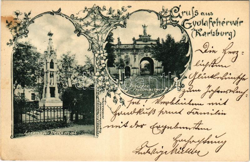 Leírás: 1898 (Vorläufer) Gyulafehérvár, Karlsburg, Alba Iulia; Losenau emlékmű, Belső várkapu / Denkmal, Inneres fenstungsthor / monument, castle gate. Art Nouveau, floral (EK)