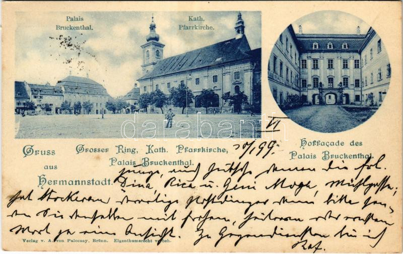 1899 (Vorläufer) Nagyszeben, Hermannstadt, Sibiu; Palais Bruckenthal, Kath. Pfarrkirche, Hoffacade des Palais Bruckenthal / Bruckenthal palota, udvar, Római katolikus plébániatemplom. A. von Palocsay kiadása / palace, courtyard, Catholic church (EK)