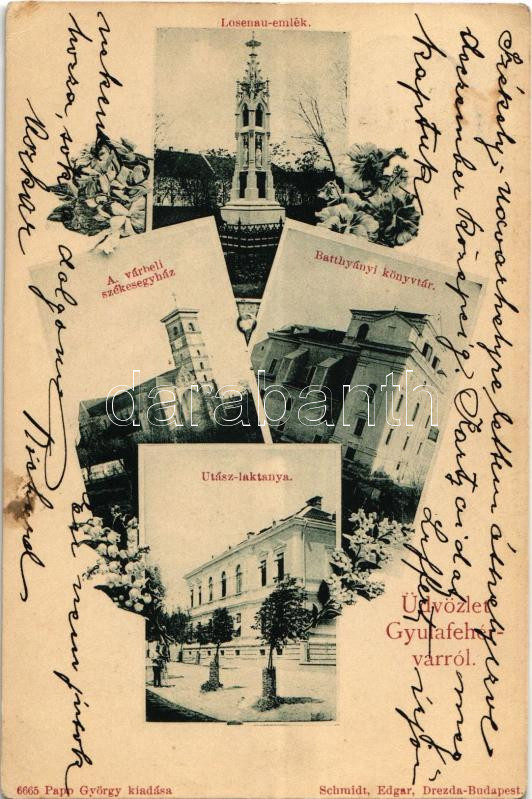 1900 Gyulafehérvár, Karlsburg, Alba Iulia; Losenau emlék, Várbeli székesegyház, Batthyányi könyvtár, utász-laktanya. Papp György kiadása / monument, cathedral, library, military barrack. Art Nouveau, floral (EK)