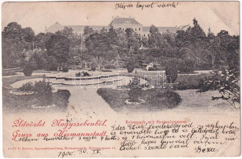 1900 Nagyszeben, Hermannstadt, Sibiu; Erlenpark mit Springbrunnen, K.u.K. Garnison-Spital / Osztrák-magyar helyőrségi kórház és az Erlen park, szökőkút. F. Binder kiadása / Austro-Hungarian K.u.K. military garrison hospital with park and fountain (lyuk / pinhole)