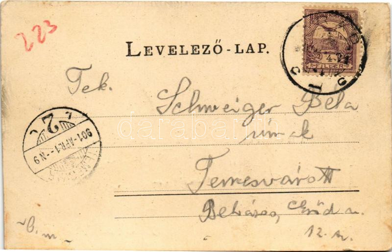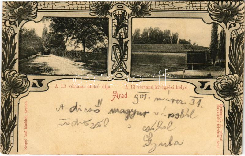 1901 Arad, A 13 vértanú utolsó útja és kivégzési helye. Kerpel Izsó kiadása, Honisch L.J. fényképész felvétele / last road and execution place of the 13 Martyrs of Arad. Art Nouveau, floral (vágott / cut)