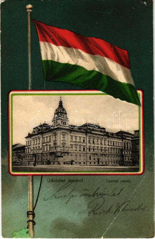 1902 Arad, Arad-Csanádi Egyesült Vasutak palotája. Szecessziós magyar zászlós litho keret / Palace of the Arad-Cenad United Railway Company. Art Nouveau litho frame with Hungarian flag (r)