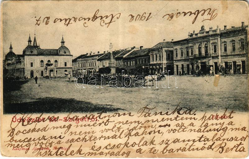 1902 Máramarossziget, Sighetu Marmatiei; Fő tér, piac, Korona szálloda és kávéház, Klein üzlete. Kaufman Ábrahám kiadása / main square, market, hotel and café, shops (kopott sarkak / worn corners)