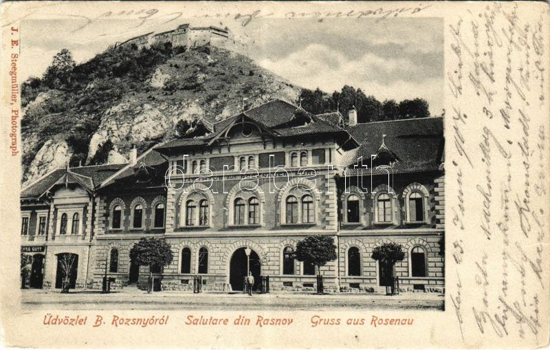 1904 Barcarozsnyó, Rozsnyó, Rosenau, Rasnov; Hotel u. Burg, Gasthaus zur Rosenauer Burg / Szálloda Barcarozsnyó várához, háttérben a vár / hotel, castle ruins. J. E. Steegmüller Photograph (EB)