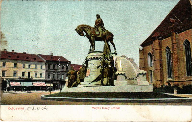 1906 Kolozsvár, Cluj; Mátyás király szobor, Fein F. üzlete, templom / ... https://www.darabanth.com/hu/444-Gyorsarveres/444.0/Kepeslapok/Erdely~2000006/1906-Kolozsvar-Cluj-Matyas-kiraly-szobor-Fein-F-uzlete-templom-statue-monument-church-~II2927023