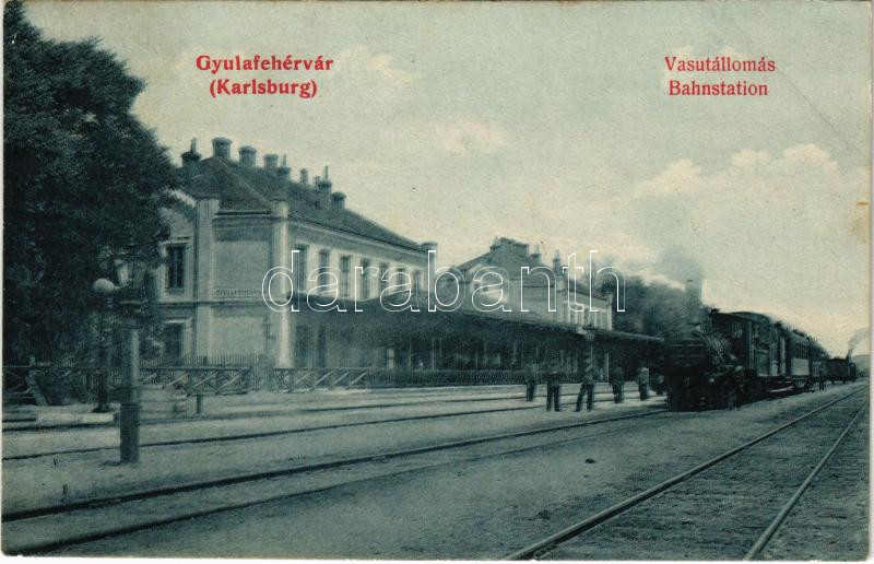 1907 Gyulafehérvár, Alba Iulia; vasútállomás, gőzmozdony, vonat. Schäs... https://www.darabanth.com/hu/444-Gyorsarveres/444.0/Kepeslapok/Erdely~2000006/1907-Gyulafehervar-Alba-Iulia-vasutallomas-gozmozdony-vonat-Schaser-Ferenc-kiadasa-ra~II2927160