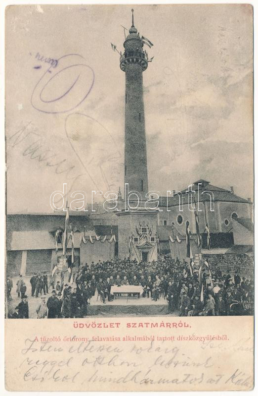 1908 Szatmárnémeti, Szatmár, Satu Mare; A tűzoltó őrtorony felavatása alkalmából tartott díszközgyűlésből / inauguration ceremony of the fire tower, firefighters (EK)