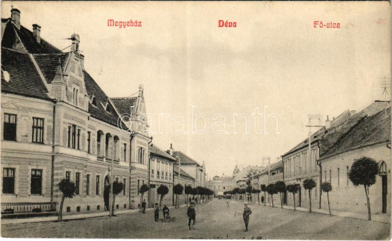 1911 Déva, Megyeház, Fő utca / county hall, main street (Rb) https://www.darabanth.com/hu/444-Gyorsarveres/444.0/Kepeslapok/Erdely~2000006/1911-Deva-Megyehaz-Fo-utca-county-hall-main-street-Rb~II2927432