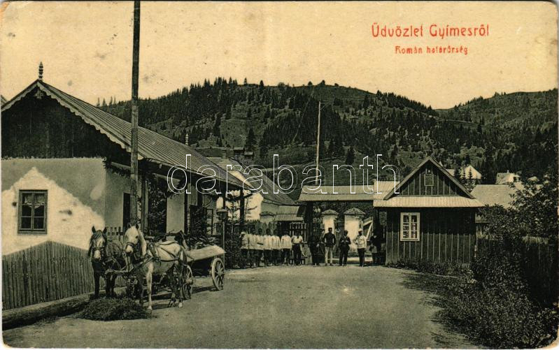 1915 Gyimes, Ghimes; Magyar-román határ, Román határőrség, határőrök. ... https://www.darabanth.com/hu/444-Gyorsarveres/444.0/Kepeslapok/Erdely~2000006/1915-Gyimes-Ghimes-Magyar-roman-hatar-Roman-hatarorseg-hatarorok-WL-1807-Hungaria~II2926214