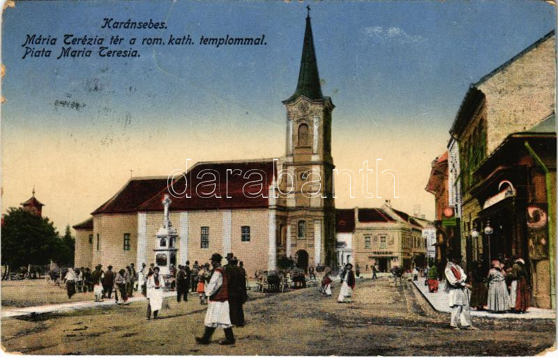 1916 Karánsebes, Caransebes; Mária Terézia tér, római katolikus templo... https://www.darabanth.com/hu/444-Gyorsarveres/444.0/Kepeslapok/Erdely~2000006/1916-Karansebes-Caransebes-Maria-Terezia-ter-romai-katolikus-templom-piac-Reisz-uzlete-~II2889527