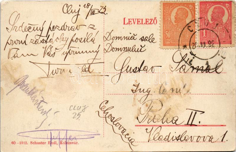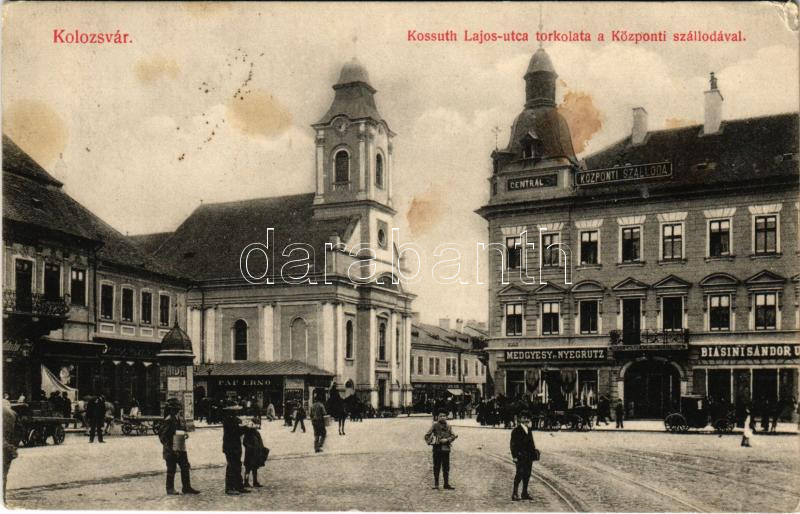 1922 Kolozsvár, Cluj; Kossuth Lajos utca torkolata, Központi szálloda, Biasini Sándor utóda, Medgyesy és Nyegrutz, Pap Ernő üzlete, gyógyszertár. Schuster Emil kiadása / street, hotel, shops, pharmacy (Rb)