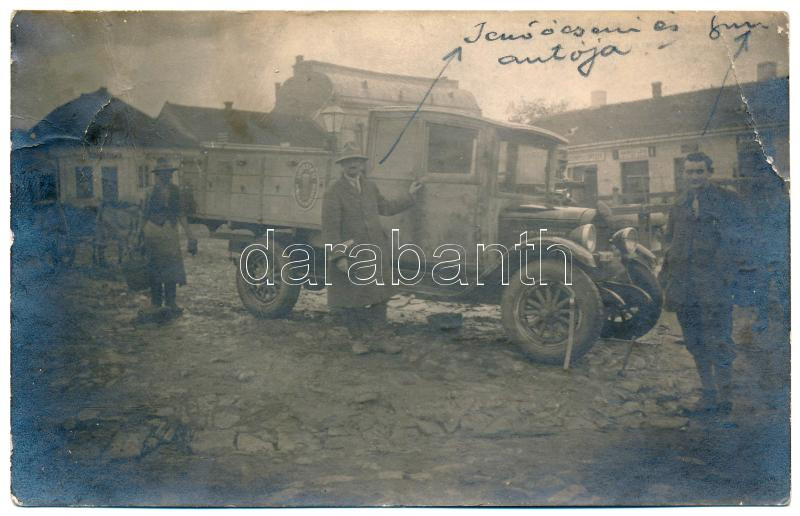 1933 Bikszád, Bixad, Bicsad; Dreher sörgyári teher autó a Fő téren, Spitzer üzlete a háttérben / truck of Dreher brewery on the main square, shops. photo + "BICSAD-SATU-MARE 282" vasúti mozgóposta (Rb)