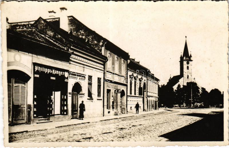 Leírás: 1941 Szászrégen, Reghin; utca, templom, Philippi & Langer könyvnyomda üzlete / street view, church, shops (fl)