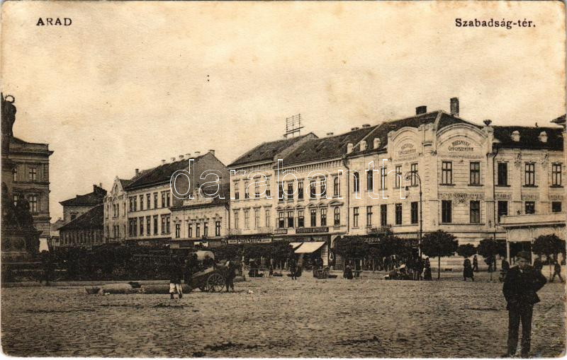 Leírás: Arad, Szabadság tér, Rozsnyay gyógyszertár, üzletek, fogorvosi műterem / square, pharmacy, shops, dentist (EK)