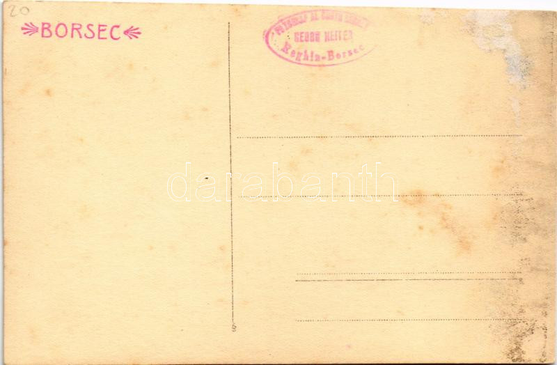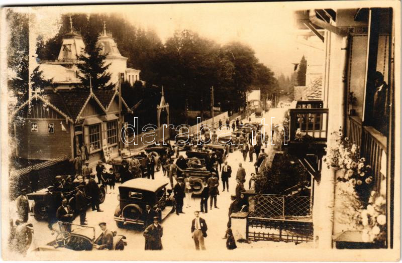 Leírás: Borszék, Borsec; autókkal érkező fürdővendégek, Bodega üzlet / spa guests arriving with automobiles, shop. Georg Heiter (Reghin-Borsec) photo (felületi sérülés / surface damage)