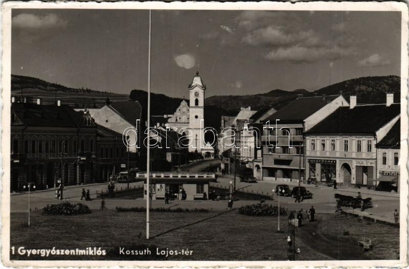 Gyergyószentmiklós, Gheorgheni; Kossuth Lajos tér, Idegenforgalmi iroda, Bíró Ferenc, Szenkovits Andor, Ifj. Zárug István, Giaconuzzi Béla, Romfeld, Lázár Dénes, Zárug L. István üzlete, cukrászda, autók / square, shops, confectionery, automobiles (fa)