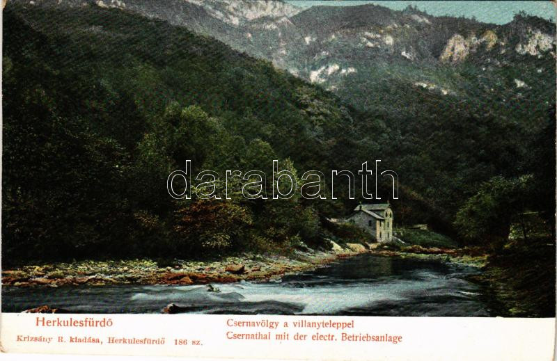 Herkulesfürdő, Herkulesbad, Baile Herculane; Cserna-völgy, villanytelep. Krizsány R. kiadása 186. sz. / Csernatal mit der elektrischen Betriebsanlage / electric power plant, power station, Cerna valley