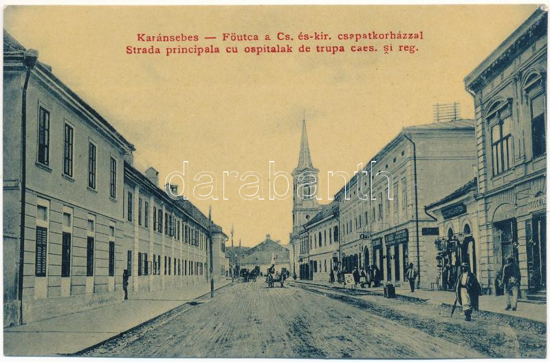 Karánsebes, Caransebes; Fő utca, Cs. és kir. csapatkórház, P. Tischler üzlete. W.L. 1457. / Strada principala cu ospitalak de trupa caes. si reg. / main street, military hospital, shops