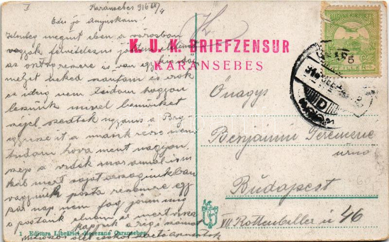 Leírás: Karánsebes, Caransebes; Korongi-féle palota, Román bank / Palatul Korongi, Casina Romana / palace, Romanian bank + "K.U.K. BRIEFZENSUR KARÁNSEBES"