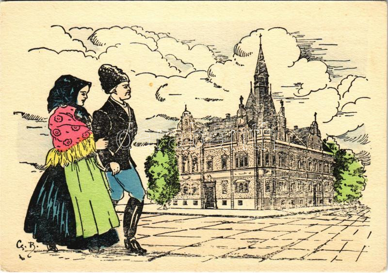Karánsebes, Caransebes; városház. Kiadja a Délvidéki Egyetemi és Főiskolai Hallgatók Egyesülete / town hall, traditional costumes, irredenta art postcard s: Cs. B.