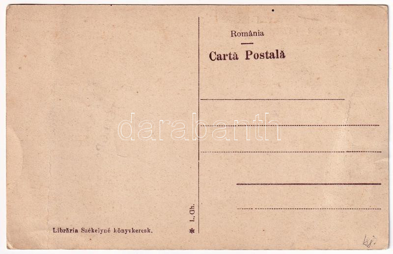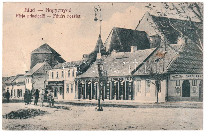Leírás: Nagyenyed, Aiud; Fő tér, Lang, Rosenthal & Palmhert üzlete, Schuster gyógyszertára / Piata principala, Farmacie / main square, pharmacy, shops (fa)
