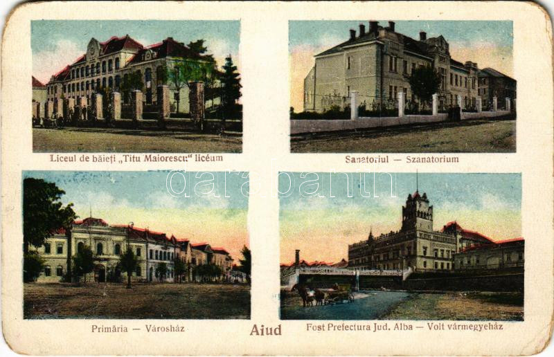 Leírás: Nagyenyed, Aiud; Liceul Titu Maiorescu gimnázium, szanatórium, városház, volt vármegyeház / grammar school, sanatorium, town and county halls (kopott sarkak / worn corners)