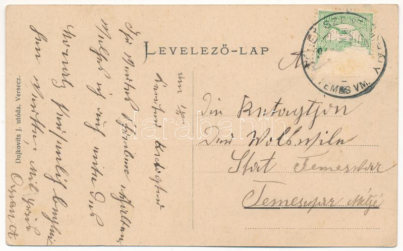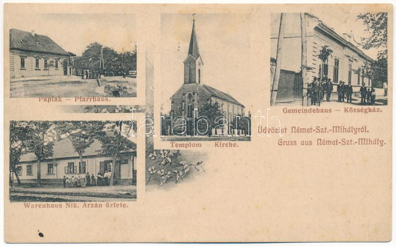 Leírás: Németszentmihály, Sanmihaiu German, Zillasch (Temes, Timis); paplak, templom, községháza, Nik. Arzán üzlete. Dajkovits J. utóda kiadása / parish, church, town hall, shop (Rb)
