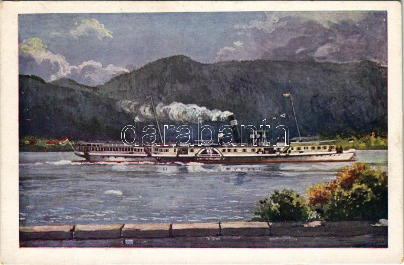 Orsova, I. Ferenc József termesgőzös, oldalkerekes gőzhajó. MFTR Művészlevelezőlap 6314-14. / "I. Ferenc József" Hungarian sidewheeler passenger steamer - képeslapfüzetből / from postcard booklet