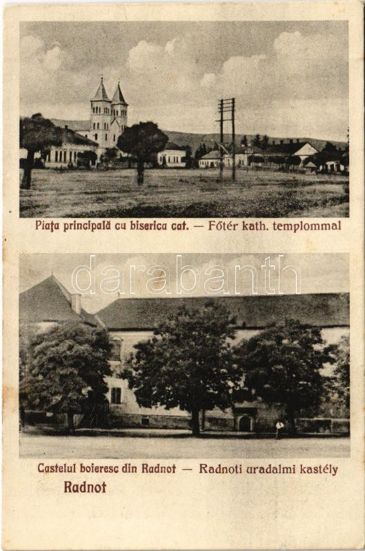 Radnót, Radnuten, Iernut; Piata principala cu biserica cat., Castelul boieresc din Radnot / Fő tér, Római katolikus templom, Radnóti uradalmi kastély (Kornis-Rákóczi-Bethlen kastély). Kántor János foto / main square, Catholic church, castle