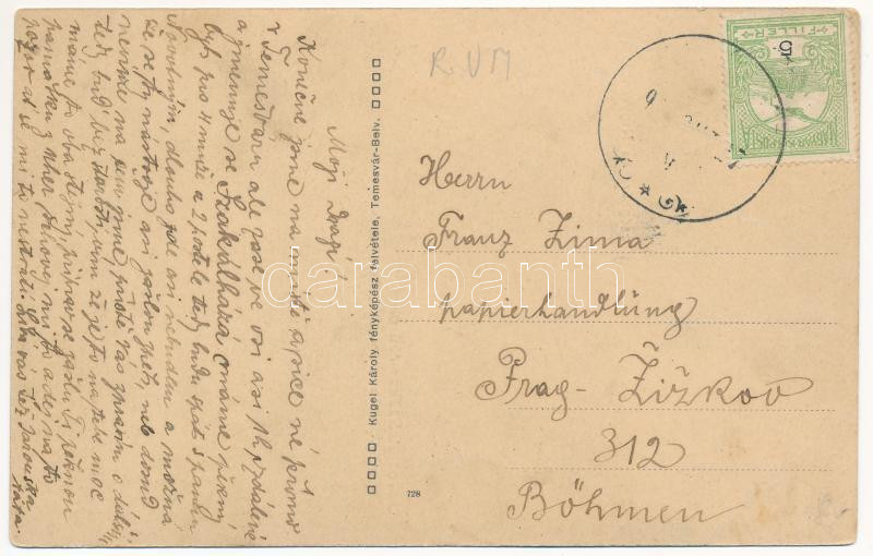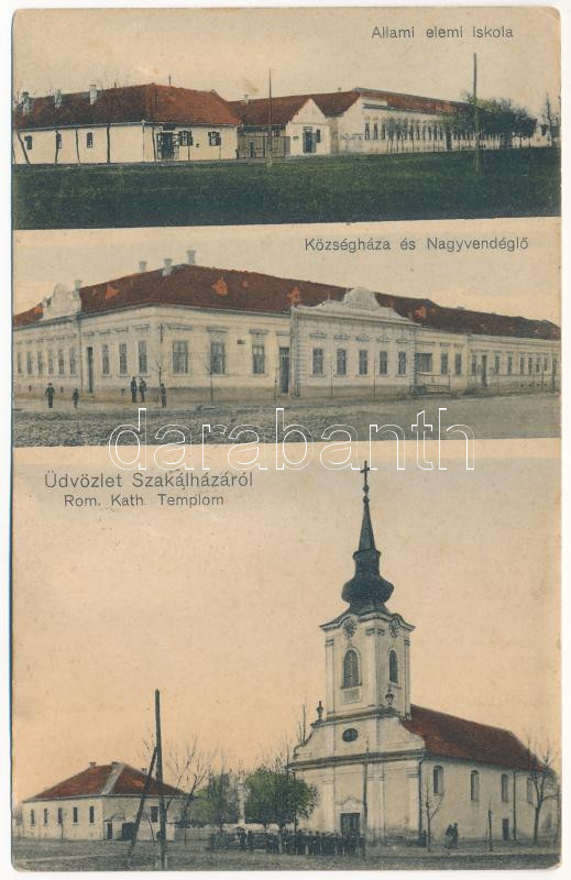 Szakálháza, Sacalaz (Temes, Timis); Állami elemi iskola, Községháza, Nagyvendéglő, római katolikus templom. Kugel Károly fényképész felvétele / school, town hall, restaurant, church