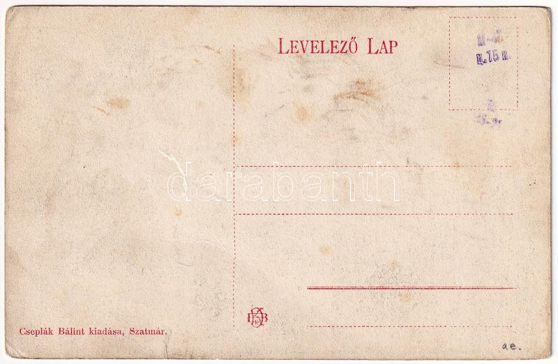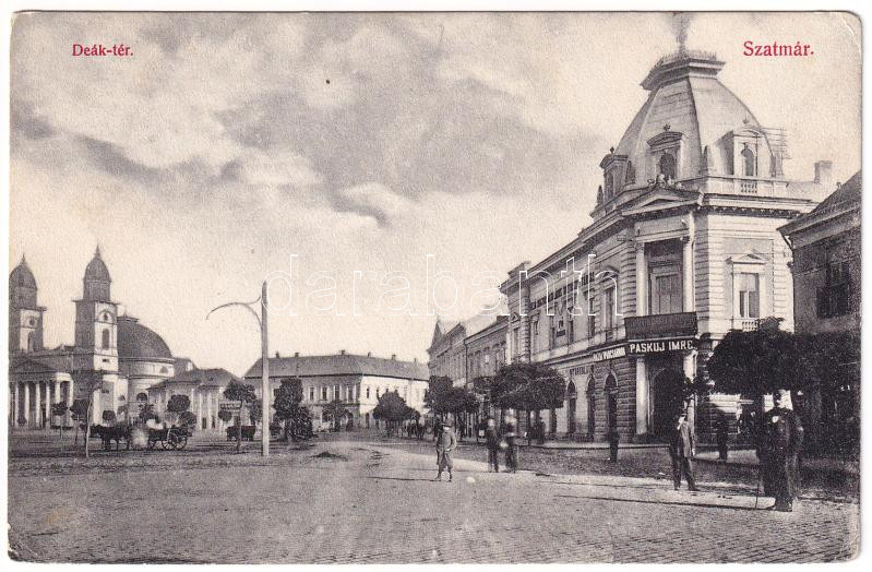 Szatmárnémeti, Satu Mare; Deák tér, Paskuj Imre üzlete, Hazai Iparcsarnok, Első Magyar Általános Biztosító Társaság, jelzálogkölcsönzés. Cseplák Bálint kiadása / square, shop, insurance company (b)