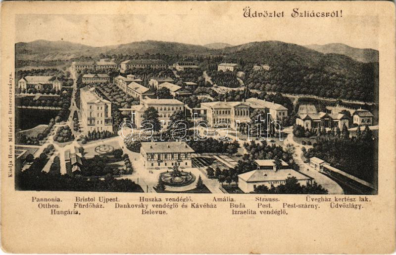 Szliács, Sliac; Pannonia, Otthon, Hungaria, Fürdőház, Buda, Bellevue, Bristol, Újpest, Huszka vendéglő, Amália, Strauss, Dankovsky kávéház és étterem, Pest és Pestszárny szálloda, Izraelita zsidó vendéglő, Üdvözlégy, Üvegház kertész lak / hotels, Jewish restaurant, greenhouse, café, villa (fl)