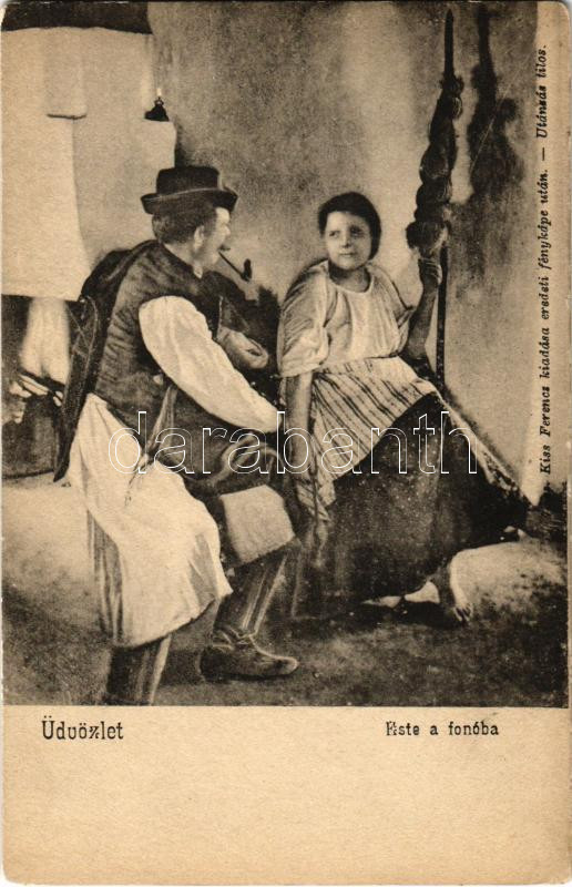 Leírás: Üdvözlet este a fonóban. Kiss Ferenc kiadása eredeti fényképe után / Hungarian folklore