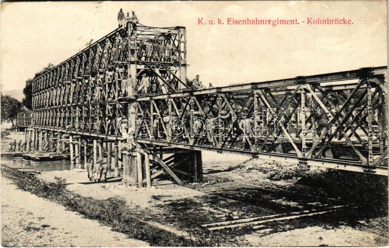 Cs. és kir. vasúti ezred hídépítés közben / K.u.K. Eisenbahnregiment. Kohnbrücke. Verlag Franz Körmer No. 80. 1913. / Austro-Hungarian railway regiment, military railway bridge construction, soldiers (EK)