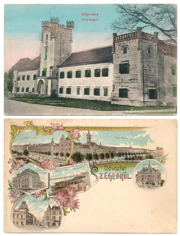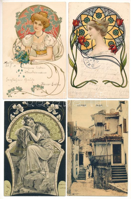 16 db RÉGI főleg hosszú címzéses képeslap vegyes minőségben: magyar és külföldi városok és hölgy motívumok, szecessziós lithok / 16 mostly pre-1905 postcards in mixed quality: Hungarian and foreign town-views, ladies, Art Nouveau litho styles