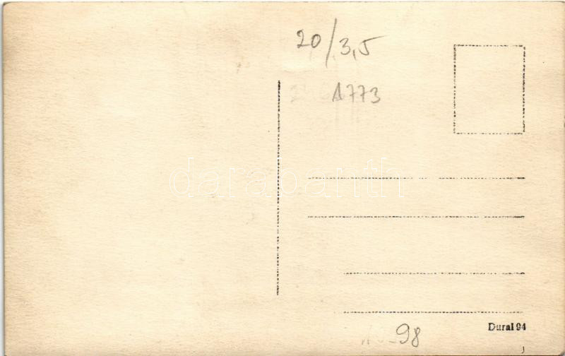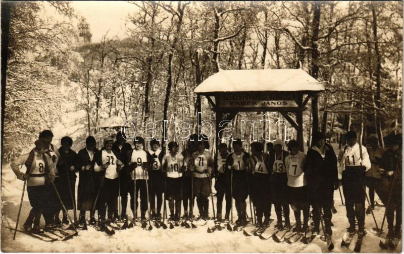 Leírás: Budapest XII. Jánoshegy, Erber János székesfővárosi vendéglő télen, síverseny előtti csoportkép síelőkkel, téli sport. photo