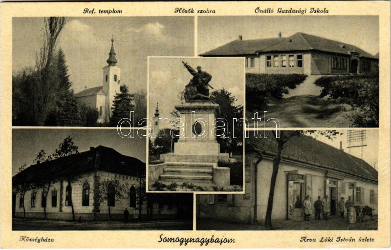 Leírás: Somogynagybajom, Református templom, Hősök szobra, emlékmű, Önálló Gazdasági Iskola, Községháza, Árva Lóki István üzlete és saját kiadása
