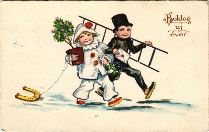 1939 Boldog Újévet / New Year greeting art postcard with chimney sweep... https://www.darabanth.com/hu/444-Gyorsarveres/444.0/Kepeslapok/Udvozlolapok-Unnepek~2000080/1939-Boldog-Ujevet-New-Year-greeting-art-postcard-with-chimney-sweeper-and-clown-fa~II2928379