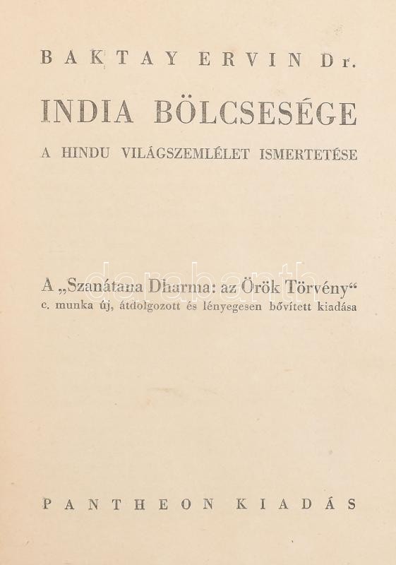 Baktay Ervin: India bölcsessége. A hindu világszemlélet ismertetése. A "Szanátána Dharma: az Örök Törvény" c. munka új, átdolgozott és lényegesen bővített kiadása. Bp., 1943, Pantheon, 256 p.+1 t. Első kiadás. Kiadói kopott, foltos félvászon-kötés, laza, sérült kötéssel, hiányzó elülső szennylappal, megviselt állapotban.